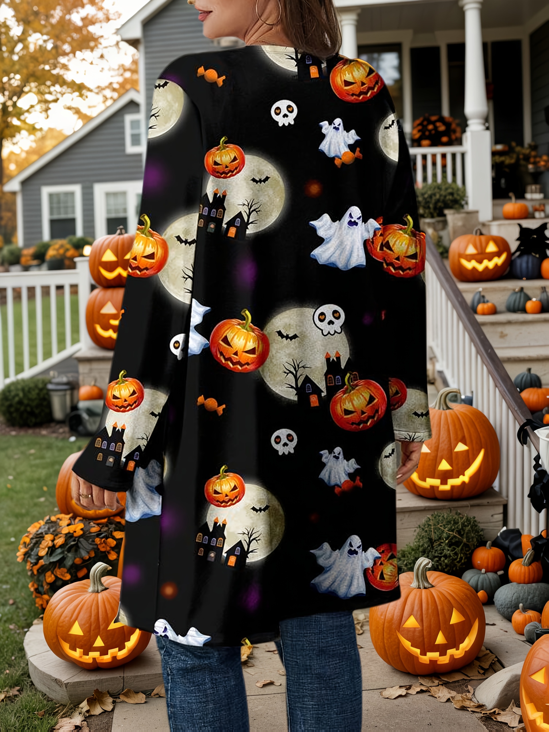 Plus Size - Plus Size Women'S Halloween Pumpkin Print Cardigan - Casual Long Sleeve with Ghosts, Bats & Autumn Leaves Design, Black & Orange, Perfect for Fall & Winter, Halloween Costume
