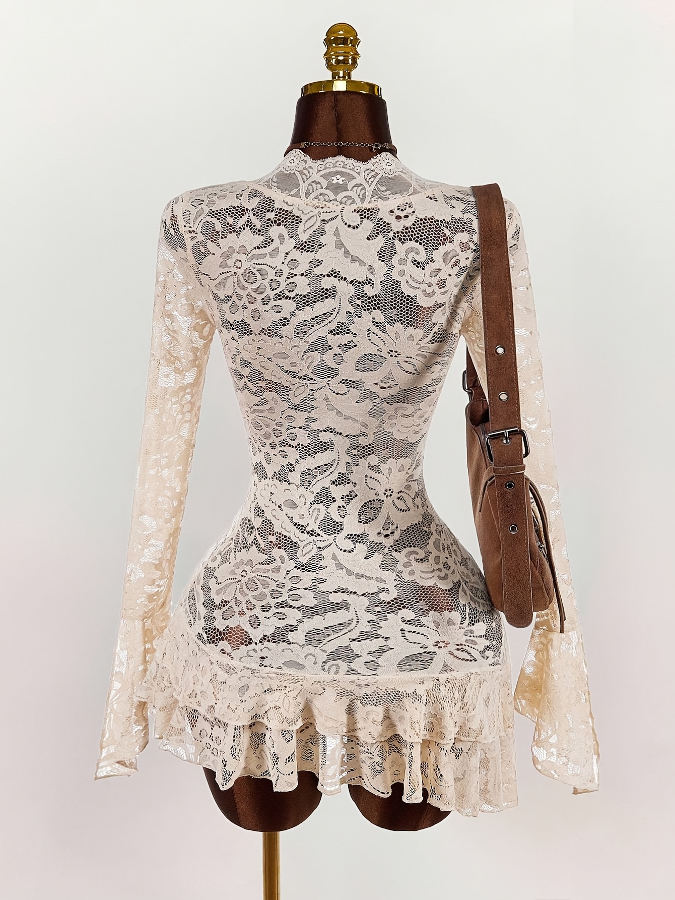 Women'S Y2K Retro Lace Top - Deep V-Neck Blouse with Flared Bell Sleeves, ElegantSexy Party & Formal Outfits, Non-See-Through Lace Shirt for Nightlife, Dates, Office - Spring/Fall Women'S Clothing, Date Night Attire, Ruffled Hem Design