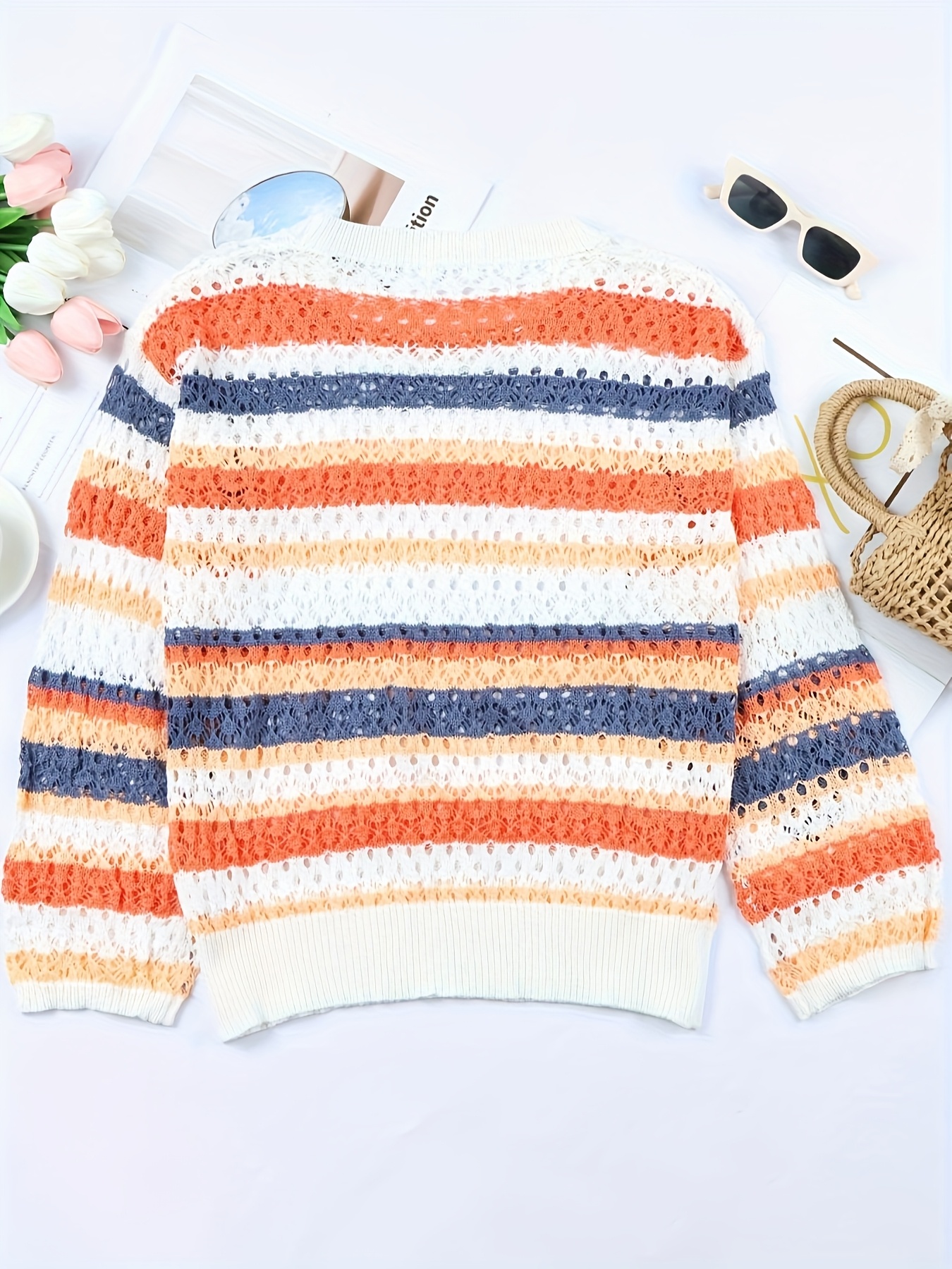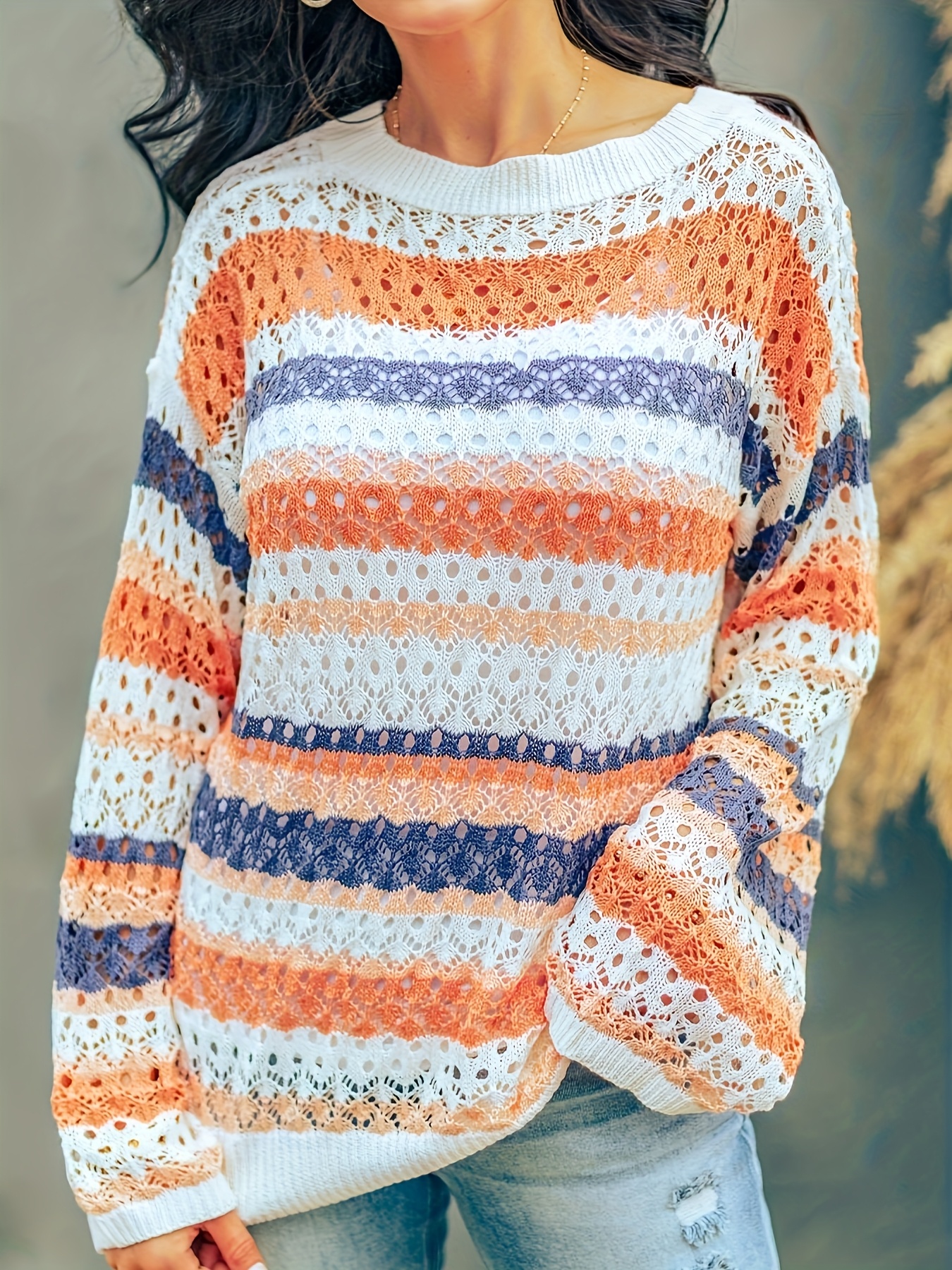 [Bohemian Knit Top] Vintage Bohemian Style Color Block Knit Top - Hollow-Out Design, Long Sleeve, Round Neck Pullover for Women