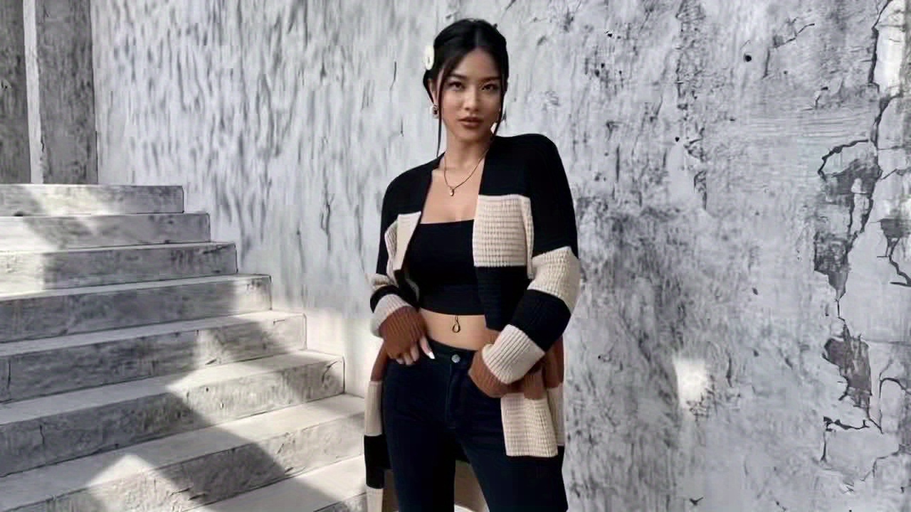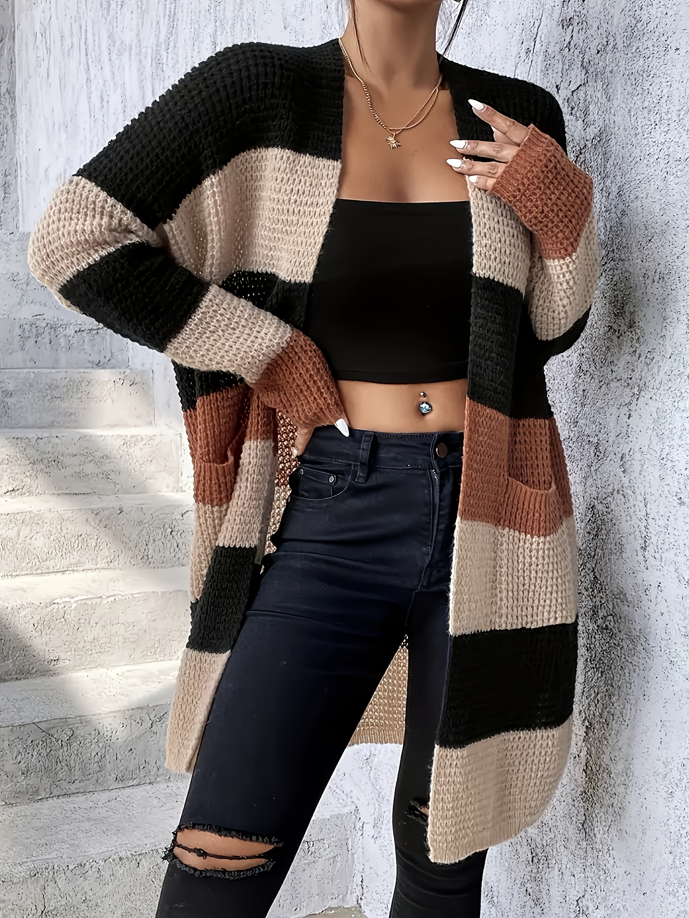 [Elegant Cardigan] Soft Elegant Women's Color Block Cardigan | Long Sleeve Mid-Length Sweater with Pockets, Relaxed Fit for Fall Winter, Casual & Formal Outfits