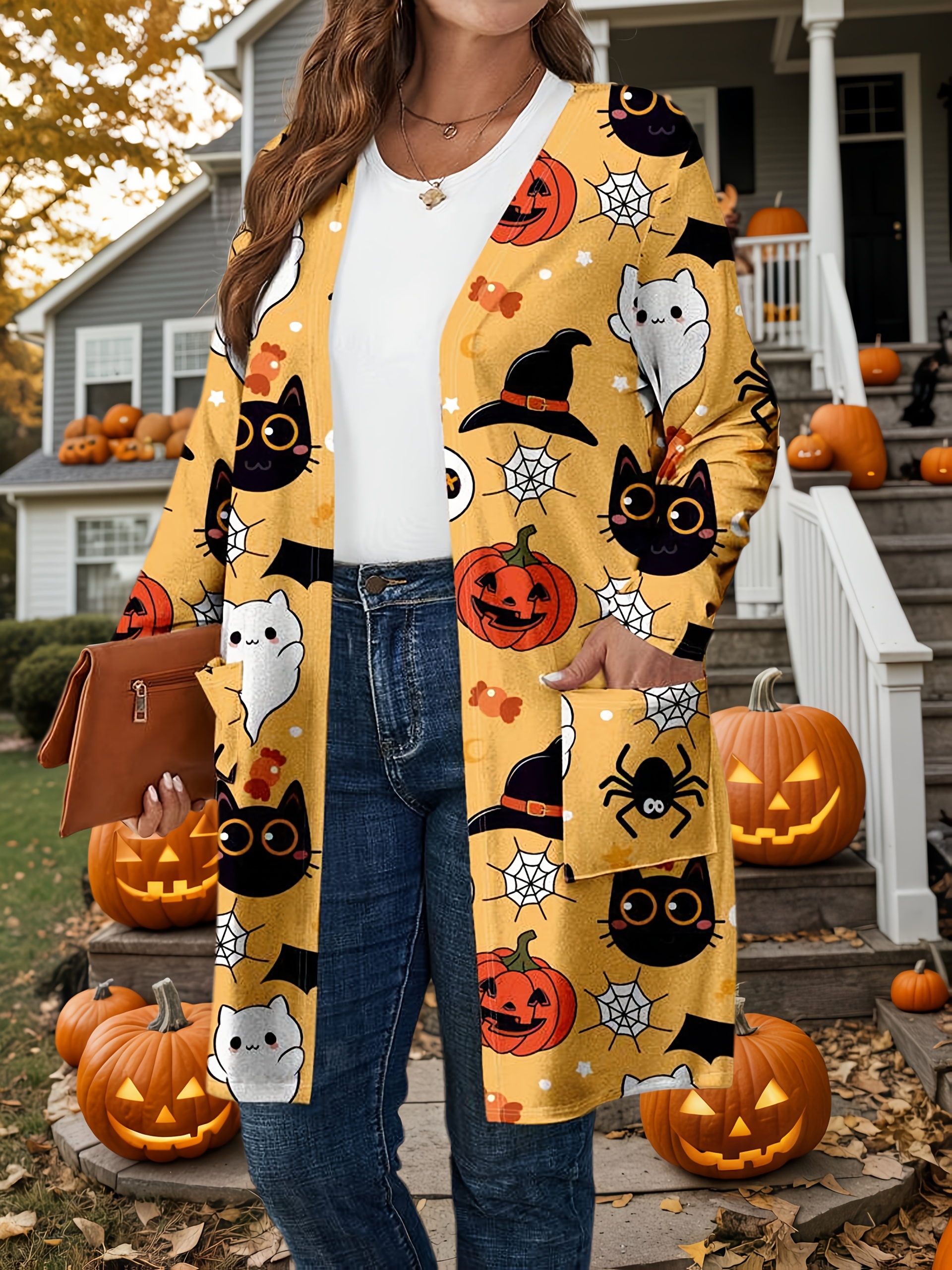 Plus Size - Plus Size Women'S Halloween Pumpkin Print Cardigan - Casual Long Sleeve with Ghosts, Bats & Autumn Leaves Design, Black & Orange, Perfect for Fall & Winter, Halloween Costume