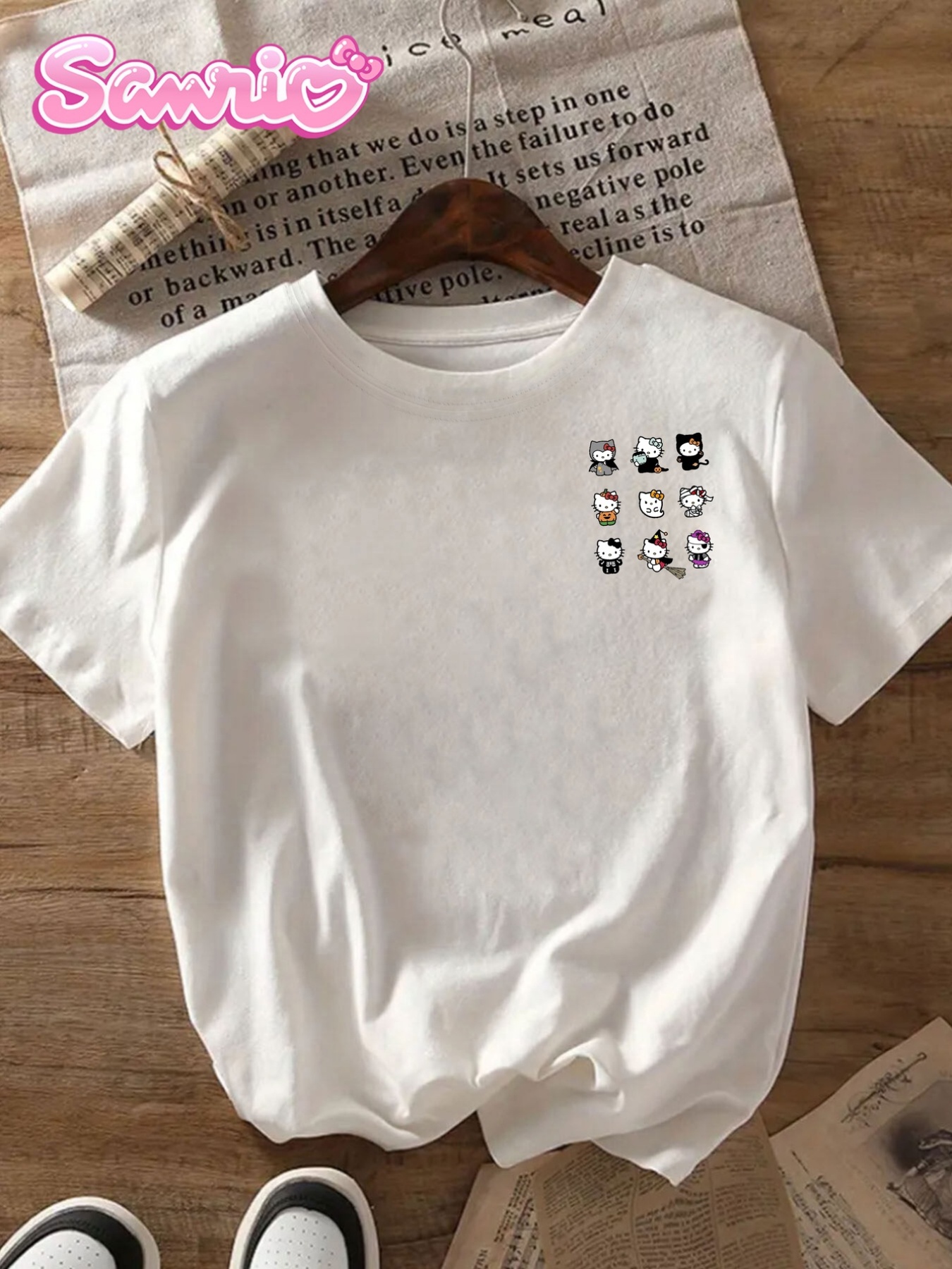 Sanrio Hello Kitty Women's Halloween Graphic T-Shirt - Front & Back Print with 12 Spooky Cute Designs, Applique Details, Casual Round Neck Tee, Machine Washable, Fashion Brand Collaboration Top