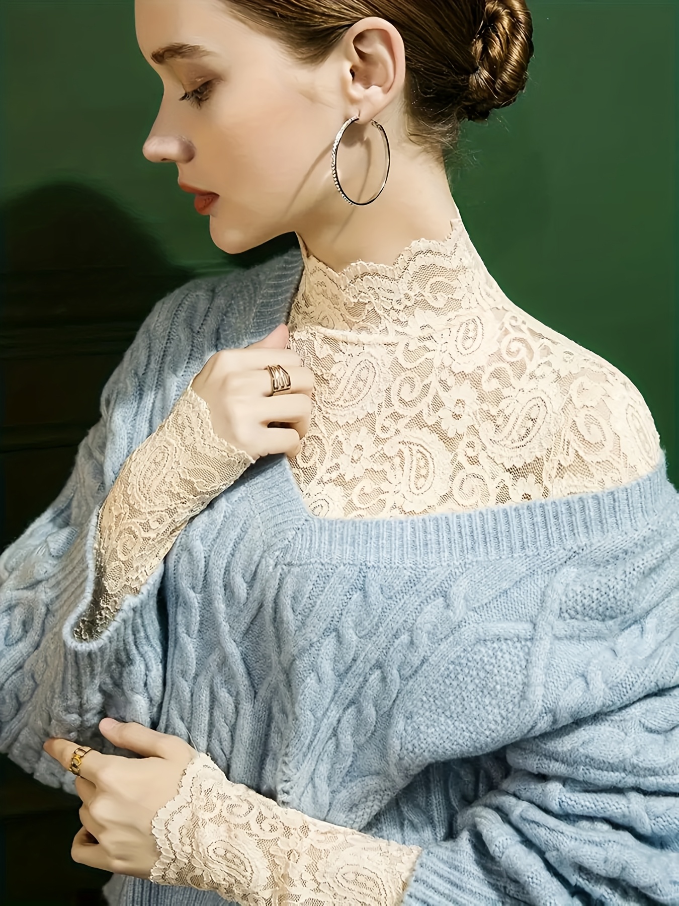 Set of 2, Solid Color Lace Tops, Featuring a Mock Neck And Elegant Long Sleeves, Perfect As a Base Layer for Spring And Autumn, Women'S T-Shirt.