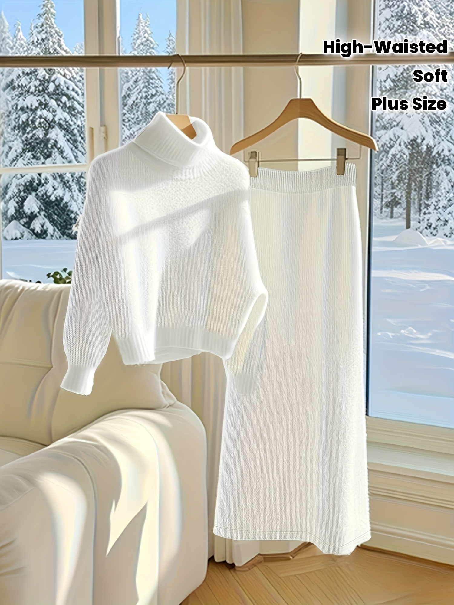White Plus Size Cozy Sweater and Skirt Set - Soft, Ribbed, Long Sleeve Top with High-Waisted, Flowy Skirt - Perfect for Winter, All-Season Comfort, Winter Clothing | Ribbed Skirt | Construction, Sweater Set
