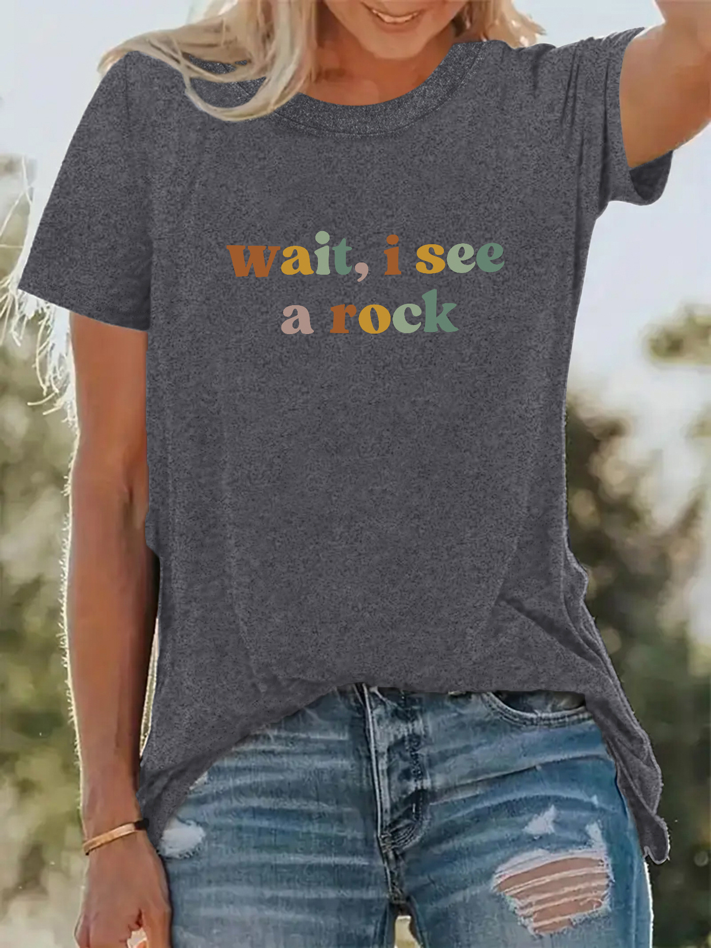 Women's Casual Short Sleeve T-Shirt - "Wait I See A Rock" Graphic Print, Stretch Polyester Blend, Round Neck Spring Summer Top, Machine Washable Sportswear, Ladies T Shirts, Vacation Clothing, Relaxed Fit Tee, Comfortable Fabric