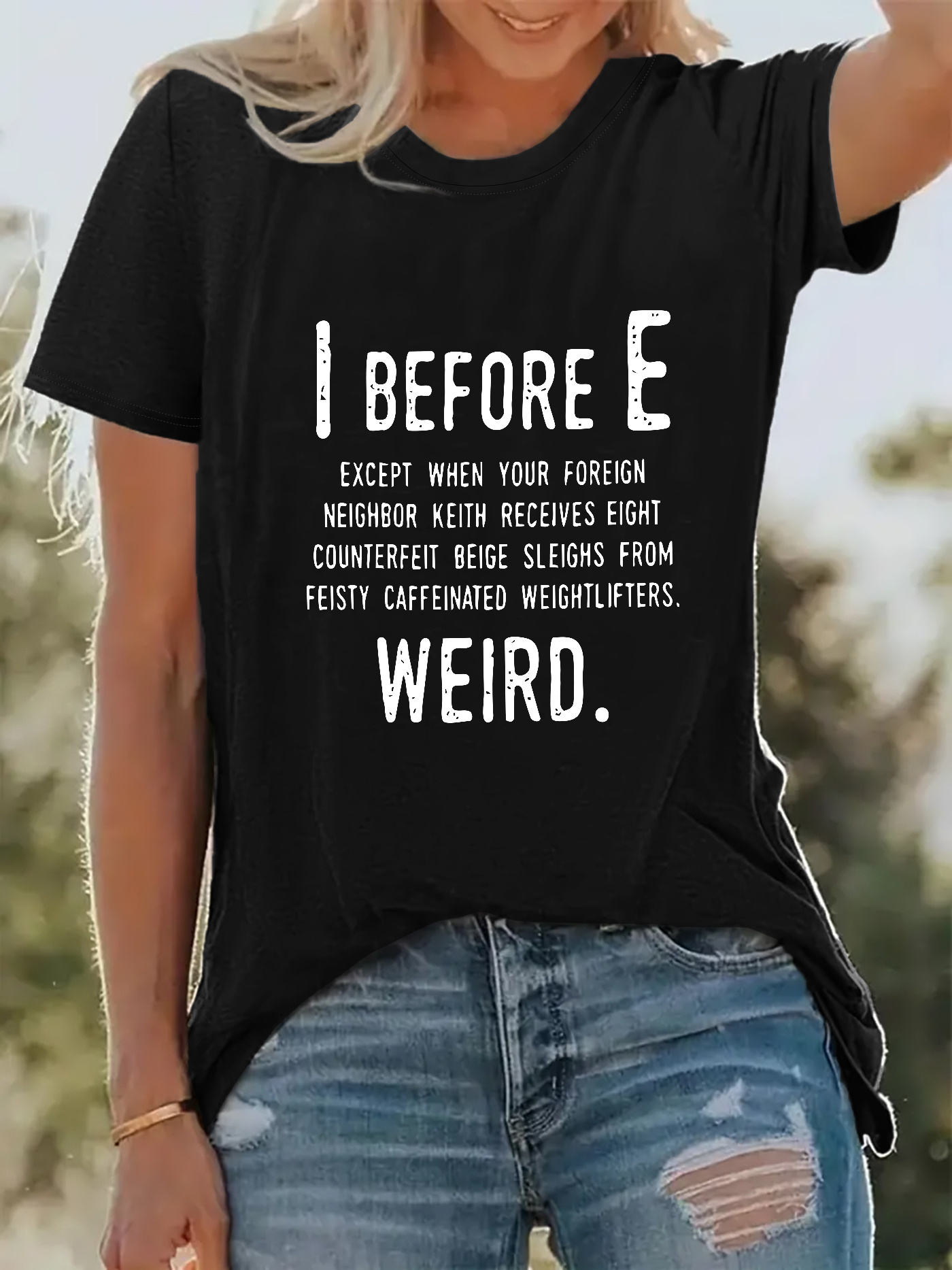 Women's Casual Short Sleeve T-Shirt with Bold "I Before E" Slogan Print - Stretch Polyester Blend, Round Neck, Machine Washable, Spring/Summer Vacation Style, Ladies T Shirts, Geometric Pattern Tee, Comfortable Fit Tee