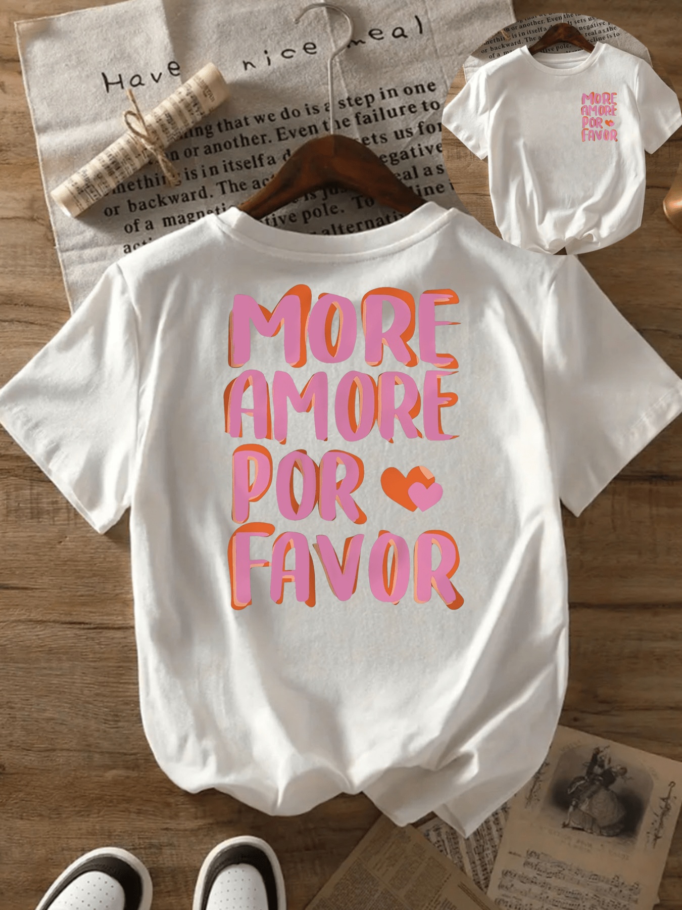 Women's Casual Short Sleeve T-Shirt with Bold "MORE AMORE POR FAVOR" Slogan Print - Black with Pink & Orange Lettering, Round Neck, Comfort Fit, Machine Washable, All-Season Versatile Top, Everyday Apparel, Playful Graphic Tee, Comfortable Fit Shirt