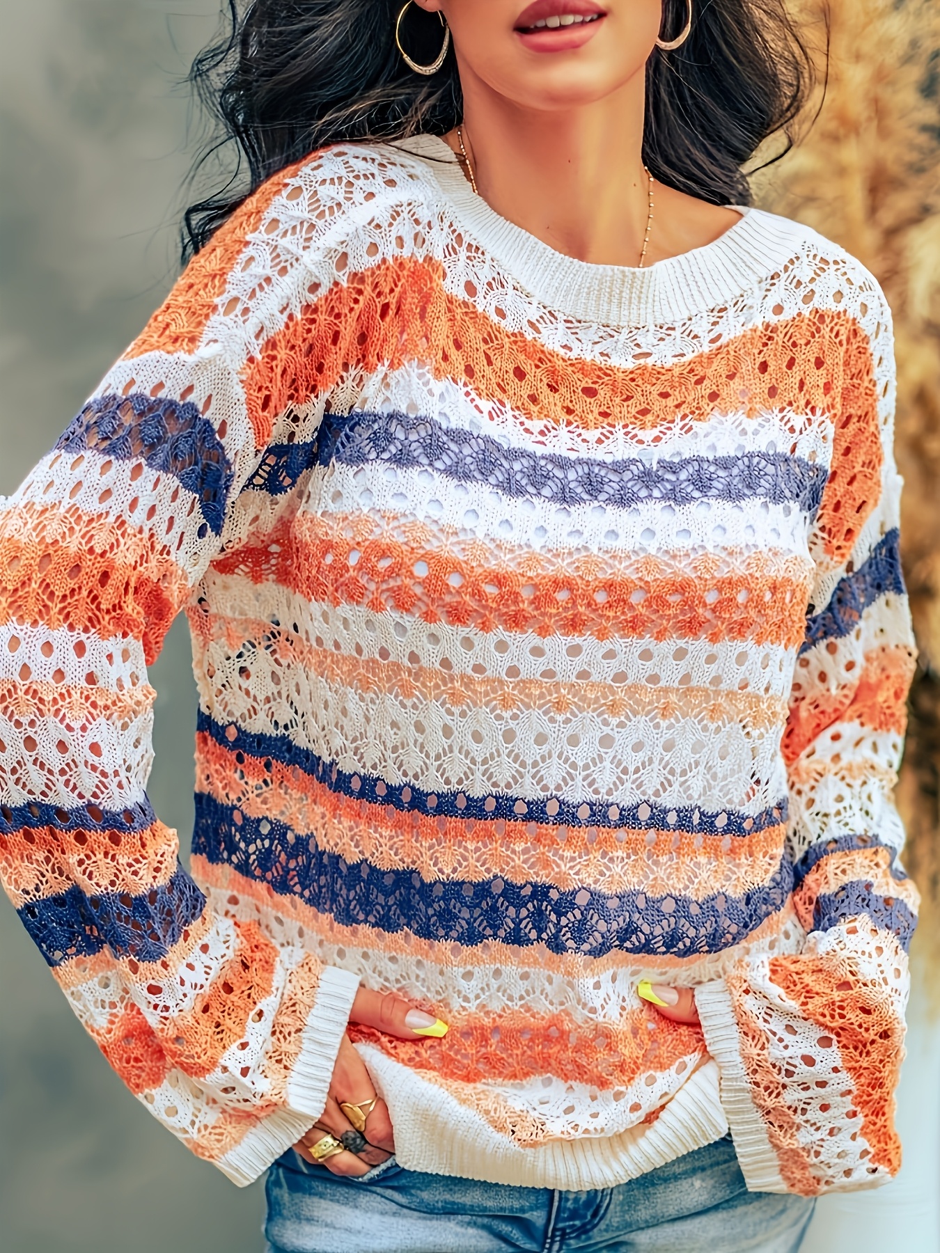 [Bohemian Knit Top] Vintage Bohemian Style Color Block Knit Top - Hollow-Out Design, Long Sleeve, Round Neck Pullover for Women